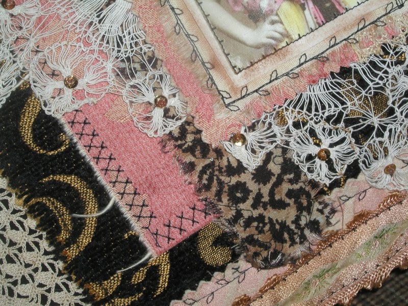 I chose a black pillow for the base of this fabric collage of vintage doilies, vintage trim and this vintage print of a girl in a fabulously embellished butterfly dress. Also added were a few sequins and pink glass beads from the last generation of crafters in the family.